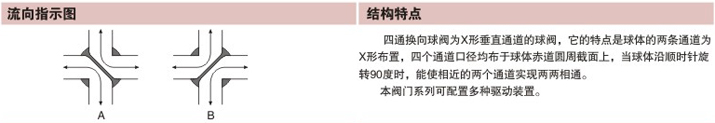 四通換向(xiàng)球閥為X形垂直通道的(de)球閥,它的特點是球體的兩條通道為X形布置,四個通道口徑均布於(yú)球體赤道圓周截麵上,當球體沿順時針旋轉90°時,能使相(xiàng)近(jìn)的兩個通道(dào)實現(xiàn)兩兩相同。